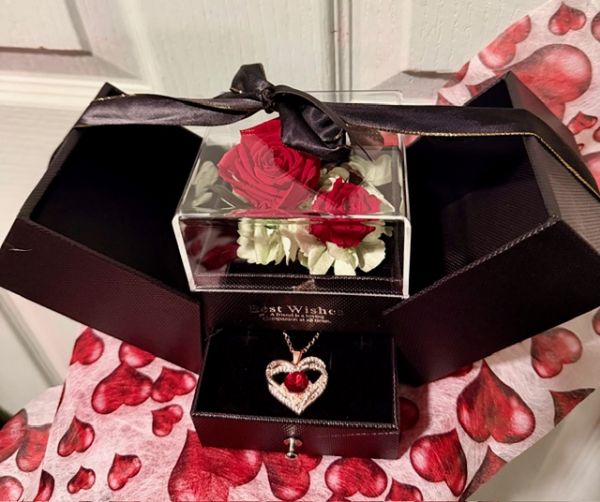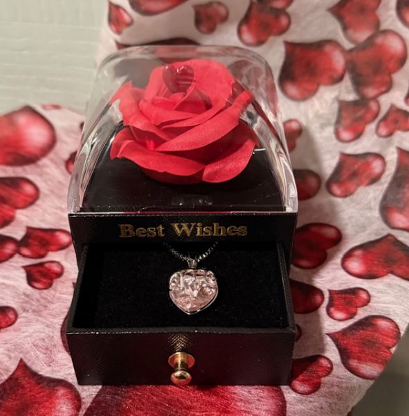 exclusive combination of a 9 cm eternal rose that hides a beautiful heart shaped necklace